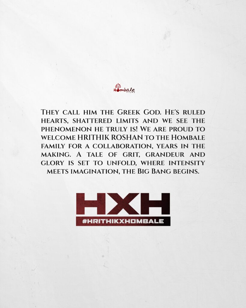 ऋतिक रोशन इन दिनों अपनी आने वाली फिल्म ‘वॉर 2’ को लेकर चर्चा में हैं. इसी बीच होम्बले फिल्म्स ने ऋतिक रोशन के साथ एक नए प्रोजेक्ट की घोषणा की है. हालाँकि इस प्रोजेक्ट से जुडी कोई जानकारी अभी बाहर नहीं आयी है,और यह भी स्पस्ट नहीं हुआ है कि इस फिल्म में ऋतिक की क्या भूमिका होगी लेकिन इस खबर से ऋतिक के फैंस काफी खुश है.