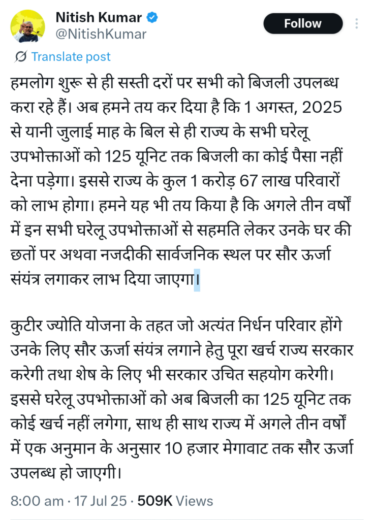 चुनावी साल में बिहार के मुख्यमंत्री नीतीश कुमार ने बड़ी राहत की घोषणा करते हुए हर परिवार को 125 यूनिट मुफ्त बिजली देने का ऐलान किया है. यह योजना 1 अगस्त 2025 से लागू हो जायेगी और इससे 1 करोड़ 67 लाख परिवारों को लाभ मिलने की उम्मीद है. साथ ही,सरकार अगले तीन वर्षों में पूरे राज्य में सौरऊर्जा संयंत्र स्थापित करने की भी योजना बना रही है.
