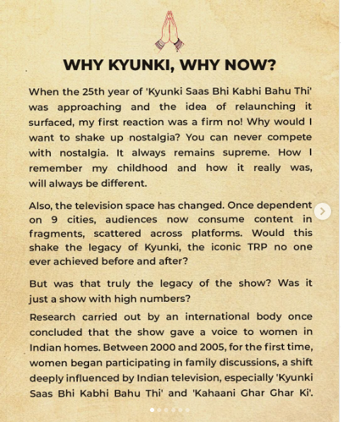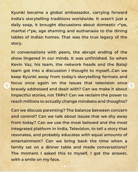 एकता कपूर ने अपने पोस्ट में शो के इम्पोर्टेंस के बारे में सवाल करते हुए लिखा,”क्या ये ‘क्यूंकि’ की उस विरासत को संभाल पाएंगे?उस ऐतिहासिक टीआरपी को,जो फिर कभी किसी और शो को नहीं मिली। लेकिन क्या टीआरपीही उस शो की असली विरासत थी? क्या वो बस अंको का खेल था? एक इंटरनेशनल संस्था के रिसर्च में सामने आया की इस शो ने भारतीय घरों की महिलाओं को एक आवाज़ दी.