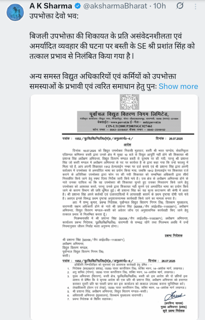 UP में बिजली अधिकारी का ‘रसूख’ पड़ा भारी,ऑडियो सामने आने के बाद ऊर्जा मंत्री ए के शर्मा ने किया निलंबित: