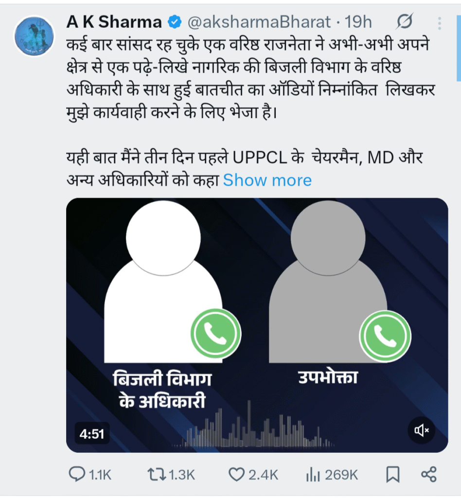 ऊर्जा मंत्री ए के शर्मा ने इस ऑडियो को अपने सोशल मीडिया हैंडल X पर शेयर किया। उन्होंने लिखा कि एक वरिष्ठ राजनेता ने यह ऑडियो उन्हें करवाई के लिए भेजा था. शर्मा ने नाराजगी व्यक्त करते हुए कहा कि उन्होंने पहले भी उत्तर प्रदेश पावर कारपोरेशन लिमिटेड (UPPCL) के चेयरमैन और अन्य अधिकारीयों को जनता से सीधे संवाद करने और उनकी समस्याओं को सुलझाने की हिदायत दी थी,लेकिन उनकी बातों को अनसुना किया गया.
